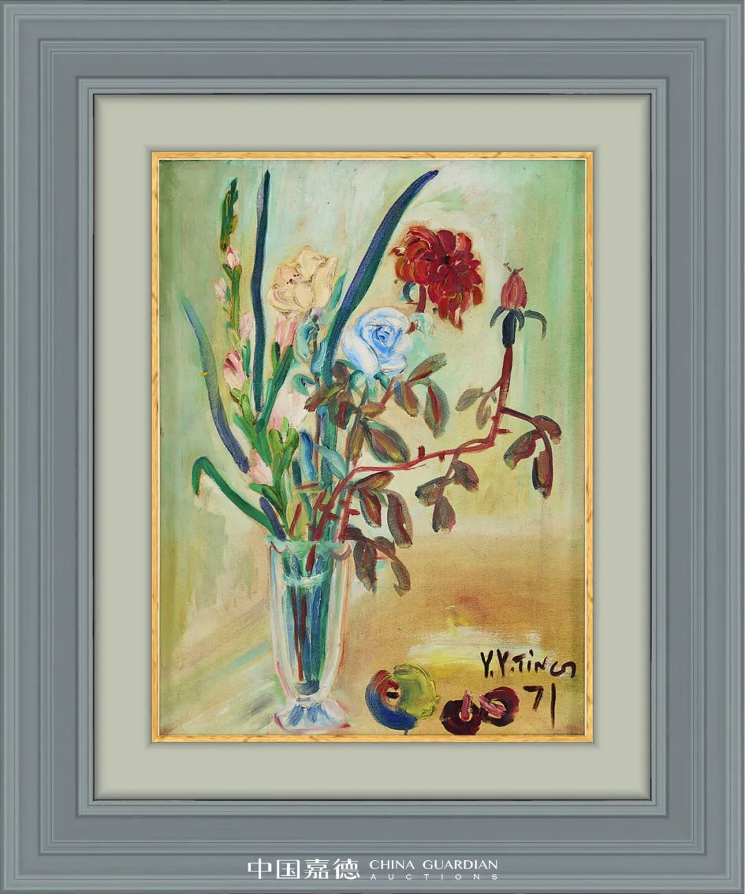 作為中國現(xiàn)代美術(shù)的開拓者,丁衍庸融合野獸派和中國傳統(tǒng)繪畫的鮮明風(fēng)格在20世紀的中國藝術(shù)中獨樹一幟。《瓶花》是拍場上罕有的丁衍庸花卉油畫代表,玫紅、淺藍、鵝黃點綴著春風(fēng)中花和葉的喜悅,明麗的色彩和空靈和諧的構(gòu)圖,展現(xiàn)出藝術(shù)家晚年對色彩搭配掌握之成熟,以及創(chuàng)作時藝術(shù)家精神上的愉悅富足與心境的豁達。丁衍庸藝術(shù)生涯僅300余幅油畫,其中花卉題材不到20幅,除香港中文大學(xué)文物館等公共機構(gòu)收藏之外,可供私人領(lǐng)域流通之作寥若晨星,本次上拍《瓶花》即為丁公晚年少有的抒發(fā)暢快心境之代表作,首現(xiàn)拍場,極為難得。