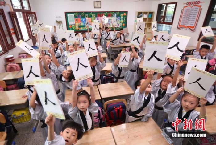 南京夫子廟小學(xué)一年級的新生身穿古代儒生禮服,在老師的帶領(lǐng)下祭拜孔子、誦讀《論語》、學(xué)寫“人”字,參加“開筆禮”儀式。中新社記者泱波攝