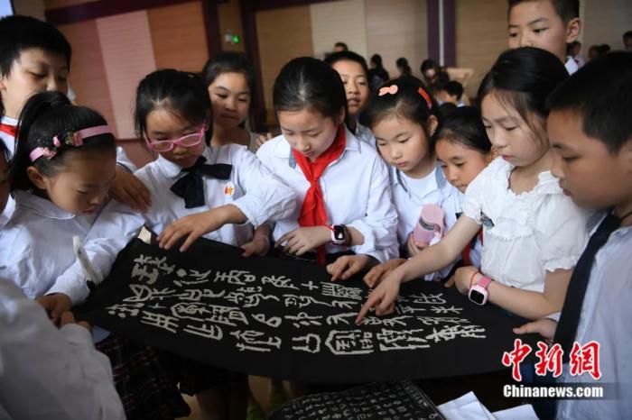 重慶南開小學(xué)的學(xué)生們在“甲骨文學(xué)堂”進(jìn)校園活動(dòng)中欣賞甲骨文書法作品。中新社記者陳超攝