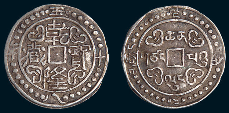 第三枚錢幣是“乾隆寶藏”。這枚錢幣鑄造于清代。清代入關(guān)以后普遍將方孔圓錢的正面用漢文,為年號(hào)加通寶,背面則用滿文紀(jì)鑄局。而這枚錢幣的特殊之處在于它的流通區(qū)域是西藏地區(qū)。本著“順?biāo)讖囊?,各因其便”的原則,照顧藏族百姓用銀傳統(tǒng),沒有像內(nèi)地那樣鑄造銅錢,而是打制銀幣,正面為漢字“乾隆寶藏”及紀(jì)年,背面是藏文“乾隆寶藏”及紀(jì)年。除文字外,正背兩面都打印有藏文化傳統(tǒng)的吉祥圖案。尤為特殊的是在銀幣的正背面中央,專門打印一個(gè)正方形圖框,像是穿孔卻沒有打透。這一獨(dú)具匠心的設(shè)計(jì),既體現(xiàn)了中國(guó)傳統(tǒng)錢幣圓形方孔的形制特征,又體現(xiàn)“乾隆寶藏”銀錢是多民族文化融合的產(chǎn)物,是中華錢幣文化大家庭中的重要一員。